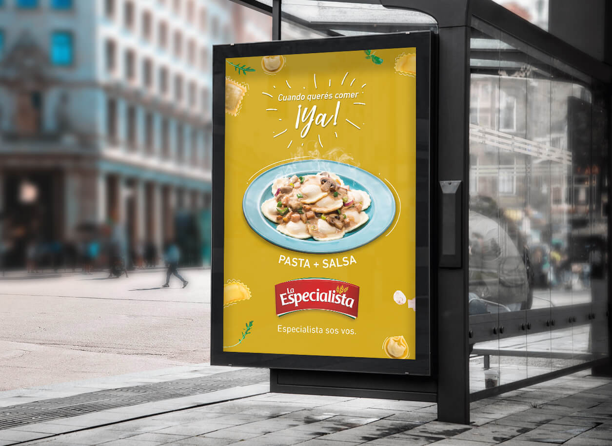La Especialista is a well-known Uruguayan artisan pasta business that chose our studio, together with Waldemar for their new campaign. This included all new and eye-catching designs for flyers (digital and printed), displays, and OOH ads. A great and fun challenge was creating the interior design of the store: modern but without losing La Especialista’s homey touch.